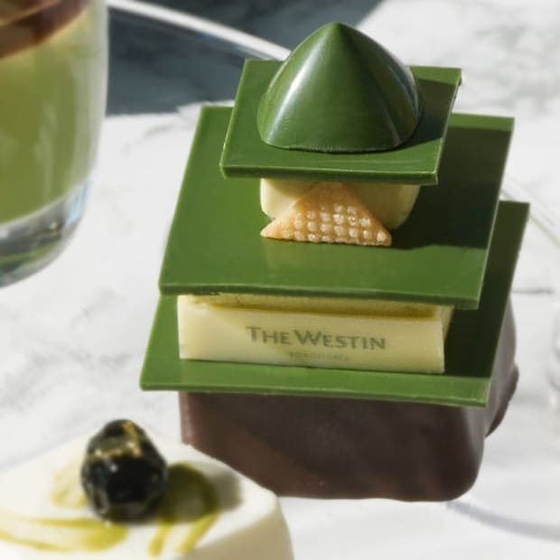 いちばんの注目は、新緑の丘に建つお城をイメージした「ウェスティンホテル横浜城 抹茶とショコラムース」。思わず写真に収めたくなる愛らしい見た目ながら、抹茶の豊かな風味を堪能できる本格的な1品。