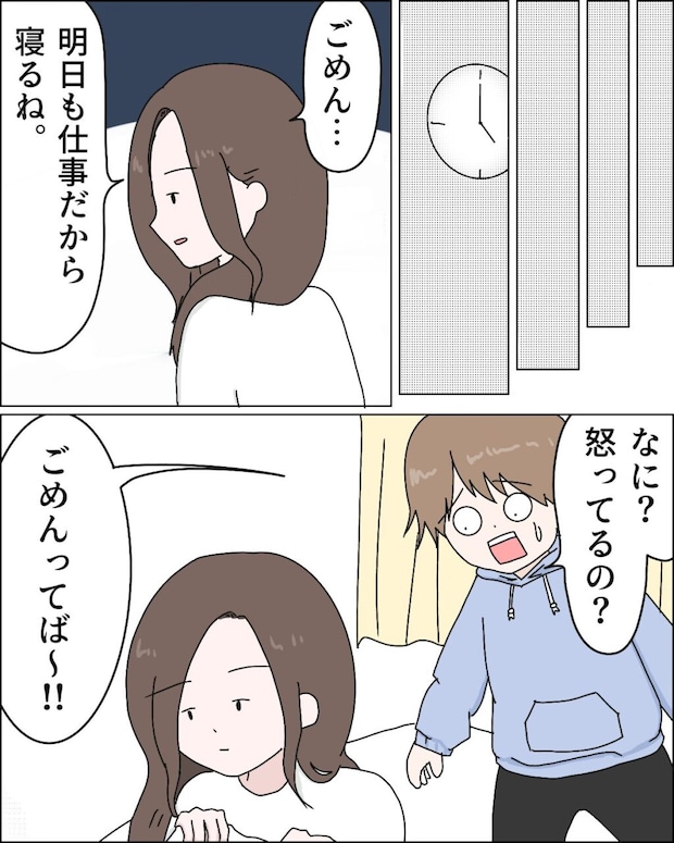 2人を送り届けて帰宅したときにはもう朝の4時になっていました。「ごめん・・明日も仕事だから寝るね」と素っ気なく言うと、「なに?怒ってるの?ごめんってば~!!」と驚いて謝ってきたレイ。