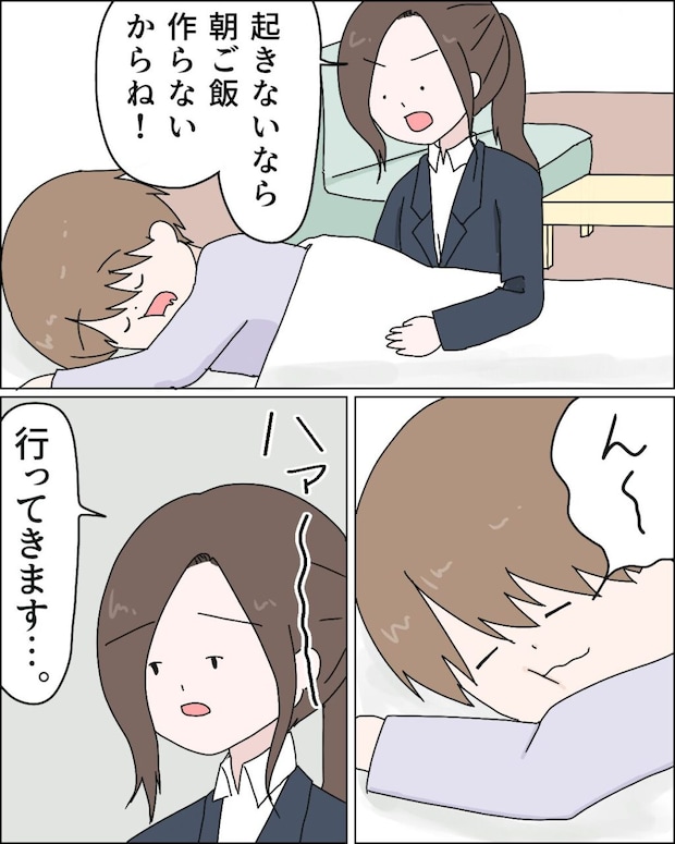 一人で朝食を食べ、身支度を整えた私は「起きないなら朝ご飯作らないからね!」と声をかけますが、「ん~」と反応はするものの目も開けないレイ。これは起きそうにないなと諦めた私は「行ってきます・・」と一応声をかけて家を出ました。