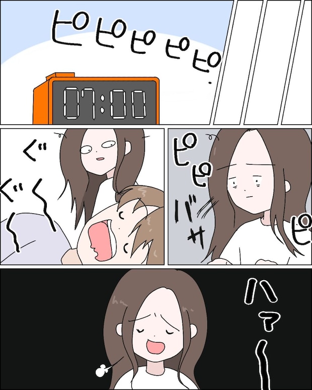 あっという間に7時のアラームが鳴りました。目を覚ますと、隣ではレイが大きないびきをかいて寝ています。3時間ほどしか寝られず眠くて仕方がない私は、アラームにも気づかず呑気に寝ているレイを見て大きな溜息。