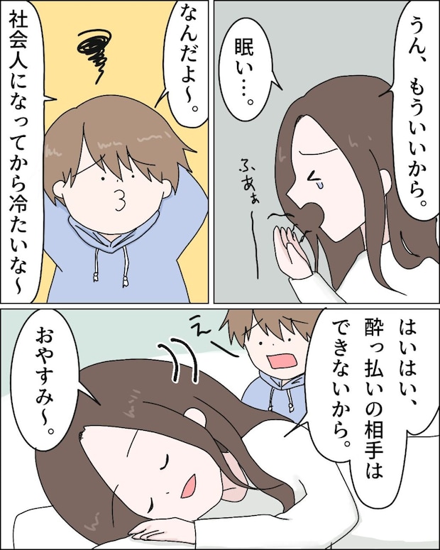 私が「うん、もういいから。眠い・・」とあくびをしながら軽くあしらうと、「なんだよ~。社会人になってから冷たいな~」と不貞腐れるレイ。もう相手にするのも面倒です。こっちは仕事があるのでこのあと遅くても7時には起きなくてはいけません。一刻も早く寝たい私は「はいはい、酔っ払いの相手はできないから。おやすみ~」とさっさと布団に入りました。