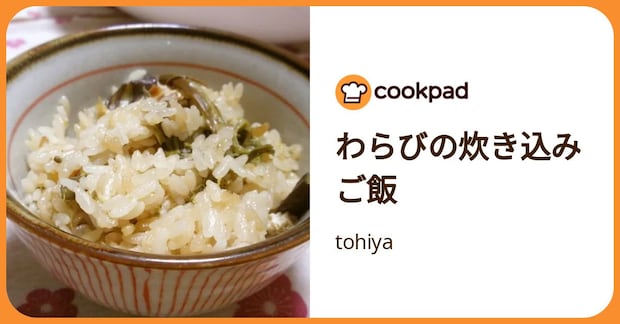 わらびが手に入ったら必ず作るというレシピ作者さんいちおしの炊き込みご飯です。あく抜きしたわらびにんじん・油揚げを、醤油・酒・和風だしの素を合わせた調味料とともに炊飯器に入れてスイッチを押すだけ。水は少し少なめにするのが、ふっくら仕上がるコツです。春の香りを食卓で楽しめる一品です。