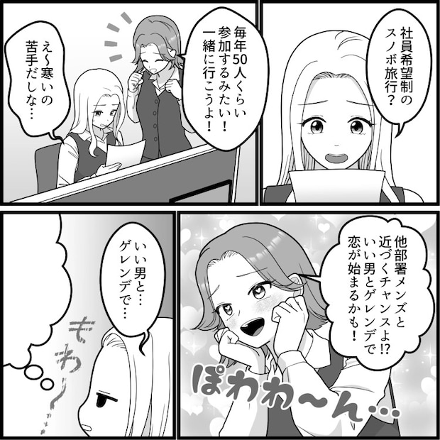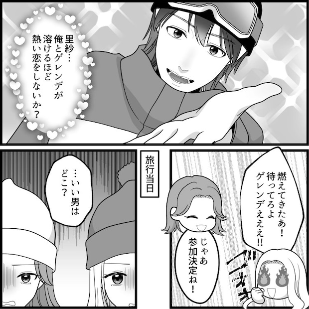 里紗は絶賛彼氏募集中のOL。ある日、同僚の奈々子に、良い男を探しに社内のスノボ旅行に行こうと誘われる。運命の出会いを期待して参加する2人だったが、参加した社員にイケメンはおらず、ゲレンデにいるのはカップルばかり。期待外れの状況に落胆していると、1人華麗な滑りを見せる男性を発見。顔は見えずとも絶対にイケメン!と思い込み突っ走る里紗だったが、なんとそこでとんでもないトラブルが起きることに!?
