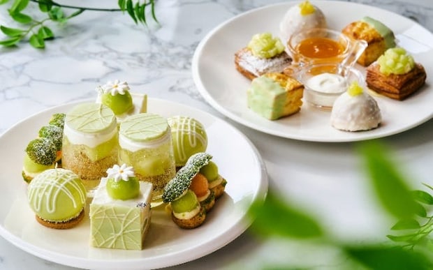 新緑に彩られたガーデンで過ごす心はずむティータイムをイメージしたプレートには、すべてのスイーツにメロンを使用したまさに“メロン尽くし”の品々がお目見え。