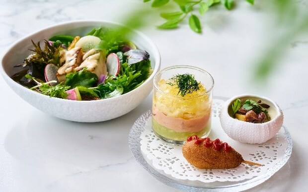 新じゃがいもと新ごぼうのヴィシソワーズにローストビーフを添えた1品をはじめ、魚介のマリネやタンドリーチキンなど、初夏の食材が彩り豊かにラインナップ。また、ホテル自家製の「ミニアメリカンドッグ」といった遊び心あふれる逸品も。