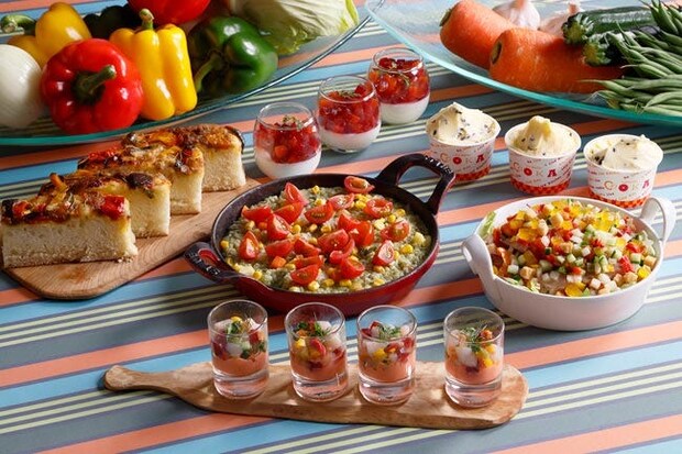 近鉄百貨店 あべのハルカス近鉄本店で開催される「ハルカスベジフェス!」とのコラボレーションメニューも登場。「緑黄色野菜とチキンのリゾット ジェノベーゼ風味」や「鶏ハムと緑黄色野菜をつかったアグロピカンテのサラダ」、「人参ムースと海老のマチェドニア」など、彩り豊かで野菜の魅力があふれる品々が揃う。スイーツ感覚で楽しめる「とうもろこしとチョコレートのジェラート」なども用意されるので、野菜の新たなおいしさを発見して。