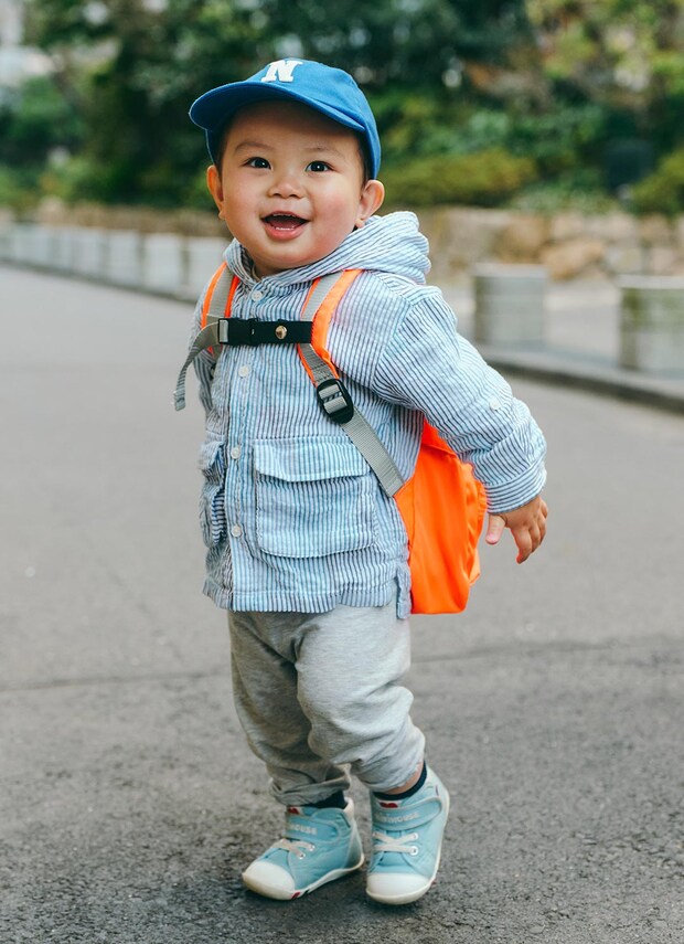 『こどもビームス』のオレンジリュックが、家族コーデの挿し色役に抜擢! 軽やかな素材に、アイキャッチになるカラーが魅力の名品。