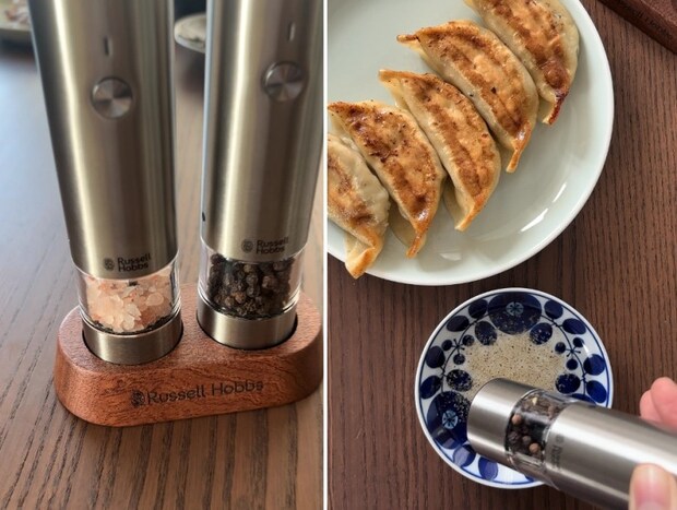 餃⼦には、酢と中挽きのこしょうがおすすめです。程よい刺激がジューシーな餃⼦の味を受け⽌め⾷欲がアップ。ミルがあるのなら、塩にもこだわることができます。粉雪のように細かく挽いた岩塩は天ぷらに合わせると素材の⽢みを引き出してウットリするおいしさです。均⼀に塩を振れるので、⿂の塩焼きやカルパッチョもバッチリ決まります。