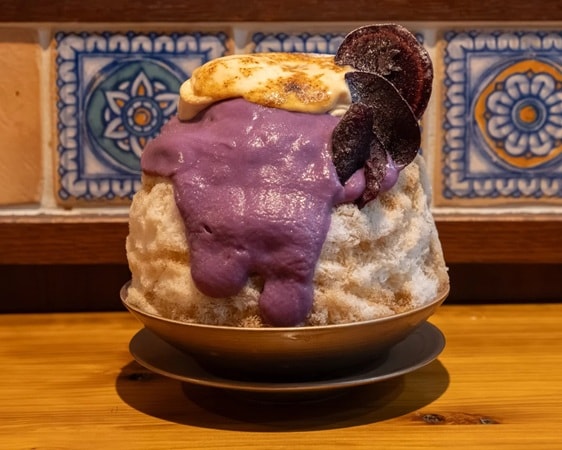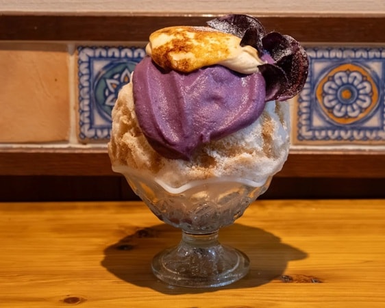 「紅芋黒糖ラテ」1,650円(税込)は、沖縄県産の紅芋を贅沢に使用した、まるで和菓子のような味わいのかき氷。紅芋のやさしい甘みとキャラメリゼしたきな粉エスプーマの香ばしさが重なり合い、奥行きのある味わいを楽しめる。紅芋チップスやわらび餅がアクセントとなり、食感の変化も魅力のひとつだ。