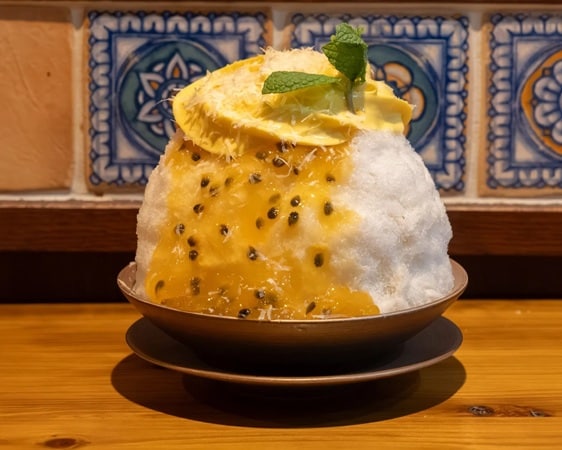 「トロピカルレアチーズ」1,650円(税込)は、南国フルーツを贅沢に使用し、レアチーズケーキを思わせる味わいのかき氷。マンゴーの濃厚な甘みとパッションフルーツの爽やかな酸味が重なり合い、これからの季節にぴったりな一杯だ。さらにパルミジャーノの塩味がアクセントとなり、味の変化も楽しめる。