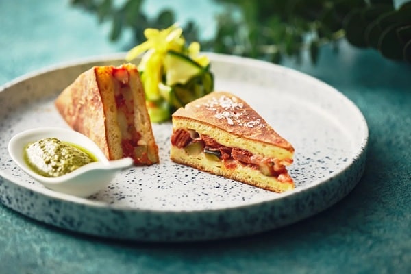 また、シェフ特製のオリジナルピザは、ジェノヴァの伝統的なセイボリーパイを、イタリアのストリートフードに着想を得て表現。ズッキーニやセミドライトマト、バジルペースト、玉ねぎとニンニクをじっくり炒めたミートソースを合わせ、仕上げに軽やかなチーズクリームとフレッシュなズッキーニを添えた。コクがありながらも軽やかな味わいで、他の食材との絶妙なバランスが際立つ一品だ。