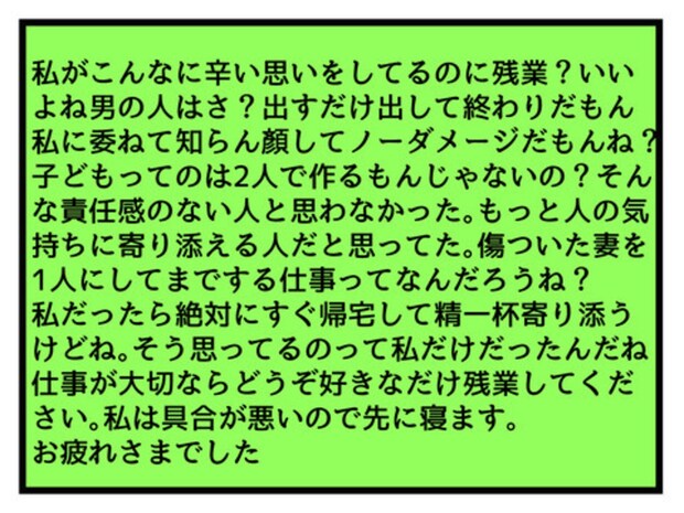 また、そんなLINEをやり取りしているところへ、夫から「残業が入った」とメッセージが…。キリコさんは怒りに任せて感情のままに夫へ返信をしますが、この内容を見た相手はどんな気持ちになるのでしょうね。