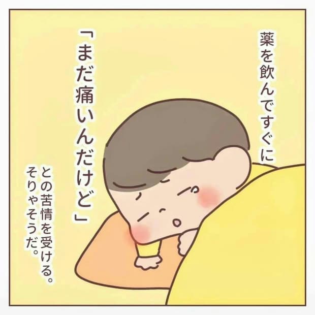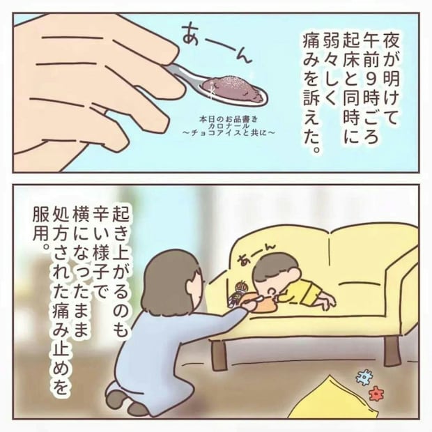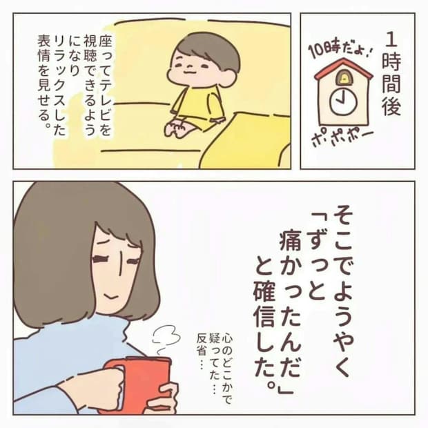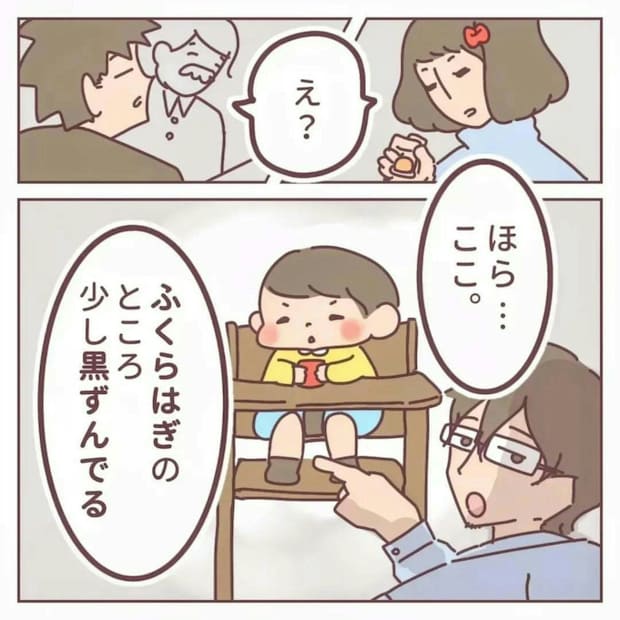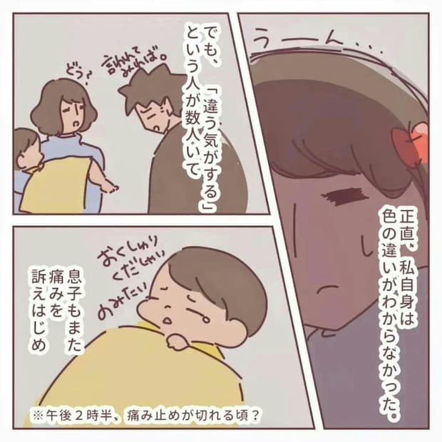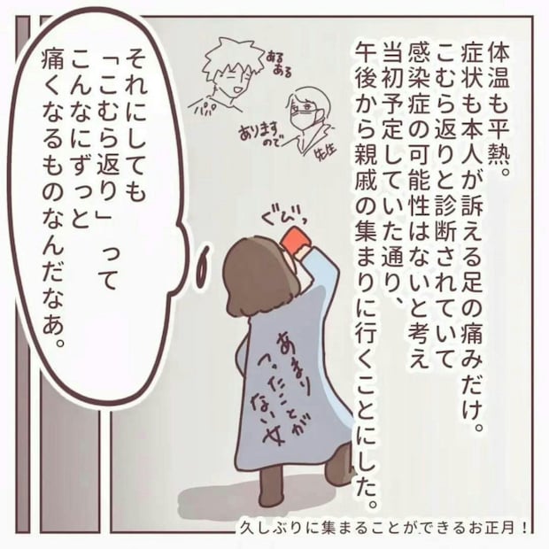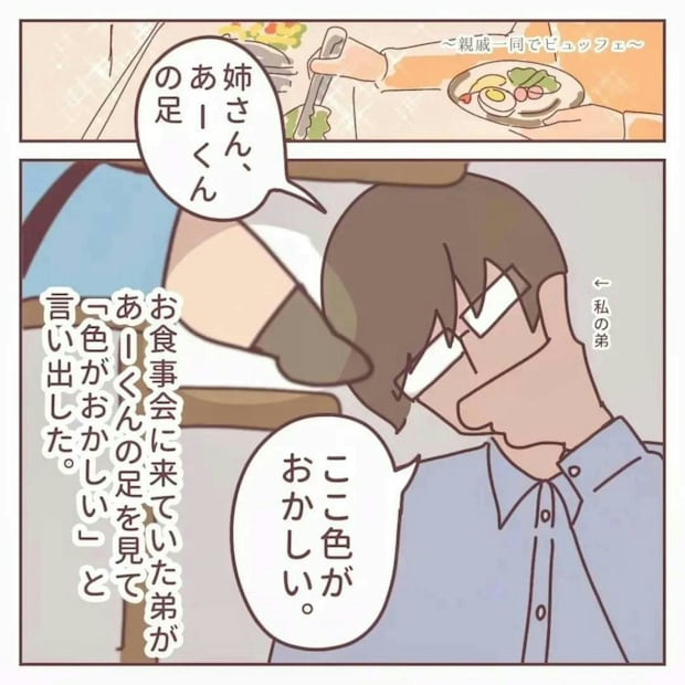 朝になっても、まだ痛みがある様子のあーくん。こむら返りにしては、ずいぶんと長く痛みがのこっている印象ですよね。平熱だったこともあり、予定どおり親戚の集まりへと行ったものの、そこで、りんごさんの弟から「足の色がおかしい」と指摘されます。