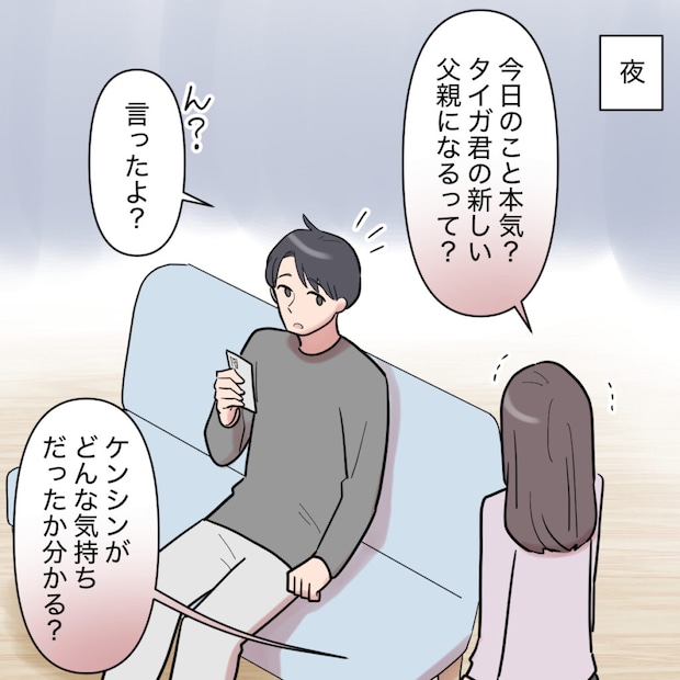 その日の夜。私はシンジに「今日のこと本気?タイガ君の新しい父親になるって」と怒りで体を震わせながら問いかけました。するとシンジはきょとんとした表情で「ん?言ったよ?」と悪びれる様子は一切ありません。私は込み上げる怒りを必死に抑えて「ケンシンがどんな気持ちだったか分かる?」とたずねます。