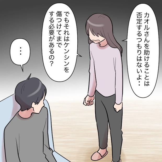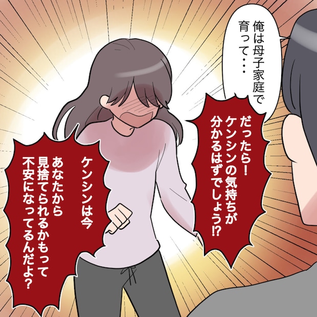 耐えられなくなった私は「母子家庭で育ったなら、ケンシンの気持ちが分かるはずでしょう!?ケンシンは今、あなたから見捨てられるかもって不安になってるんだよ?」と必死に声を荒げます。