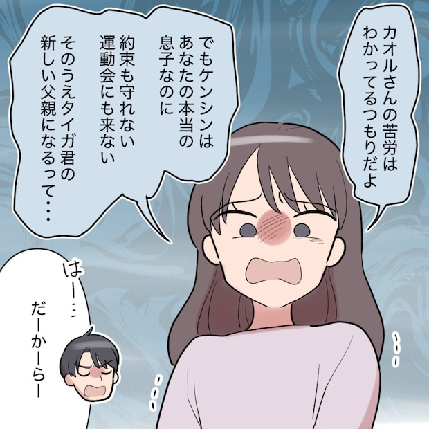 シンジの言い分は分かります。だけど、ケンシンはシンジの息子なのに、約束も守ってくれない、運動会にも来られない、そのうえタイガ君の新しい父親になるなんてあんまりです。しかし、必死にそう伝えてもシンジには届かないようで「だーかーらー、俺は母子家庭で育って・・・」と話は平行線。
