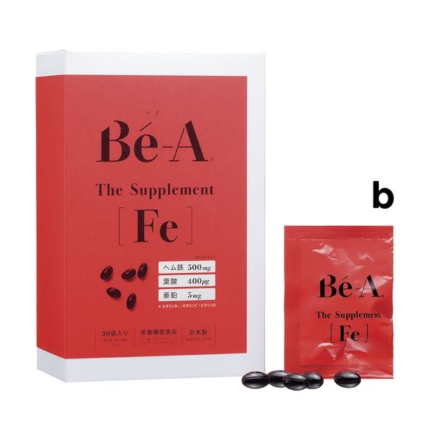 a ヘム鉄のほか、亜鉛などバランスよく成分を配合。the Fe 60粒 ¥6,156(TAKAKO STYLE) b 吸収率の高いヘム鉄に、亜鉛、葉酸、ビタミンなど6種の栄養を凝縮させた医師監修のサプリメント。ベア ザ・サプリメント Fe 30袋/30日分 ¥4,750(ベア)
