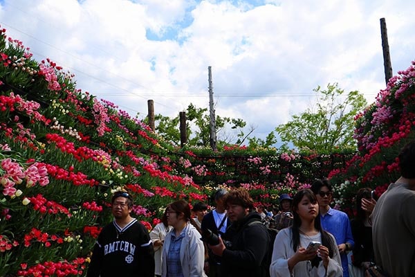 高さ4mの回廊を、会期前半は雪の壁をイメージした白いチューリップ、後半は色とりどりのチューリップで春爛漫を演出していく。