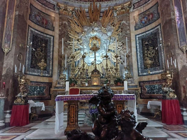 入り口を入った正面にある祭壇は、バロック的な光の装飾が印象的です。