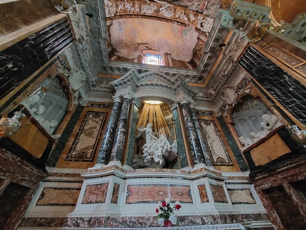 向かって左手に位置するのが、バロックの天才ジャン・ロレンツォ・ベルニーニの傑作『聖テレーザの法悦』。天使が手にする黄金の矢に貫かれる聖女の表情が官能的で、多くの美術ファンが鑑賞しています。