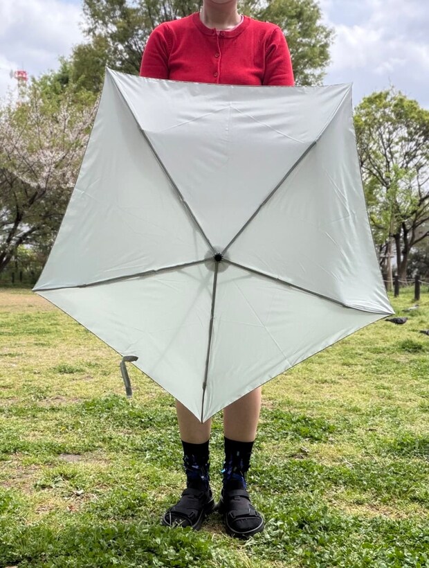 晴雨兼用なので雨の日も使えますが、高身長の筆者にはちょっとサイズが小さめだったので、日傘用として使用したいかも。¥1,990とリーズナブルなので、そういった思い切った使い方もできちゃいます。あと、ライトオレンジやスモーキーブルーなど、色バリが豊富なのも個人的には高ポイント。