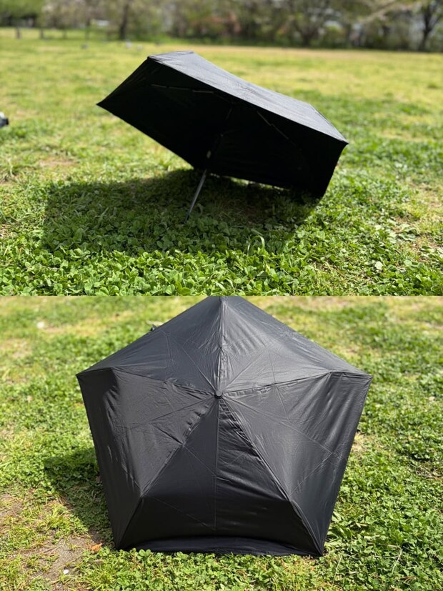 傘ブランド【Wpc.】から昨年誕生したブランド【go-koh(ゴコウ)】の中でも最も軽い晴雨兼用折りたたみ傘。これは超軽量の生地とカーボン骨で実現しているのですが、特に注目すべきは生地です。軽さを意識すると強度が心配になりますが、糸を格子状に織り込んだリップストップ遮光生地を採用することで、軽くて丈夫を可能にしているんです。しかも生地の裏面に樹脂の多層コーティングを施すことで、遮光率&UVカット率100%、UPF(紫外線保護指数)は最高等級のUPF50+、遮熱効果も備えているのも優秀ポイント。