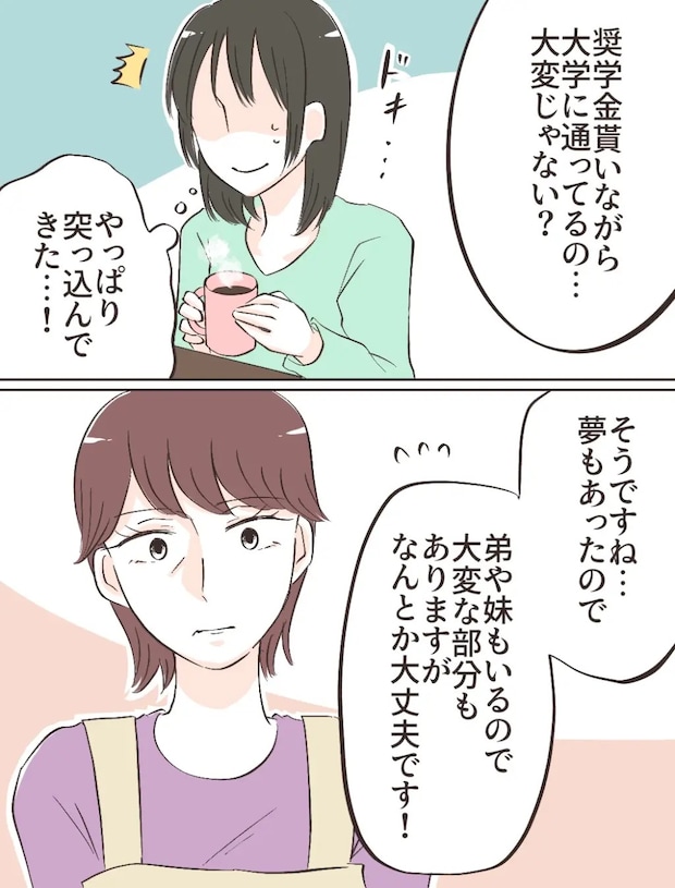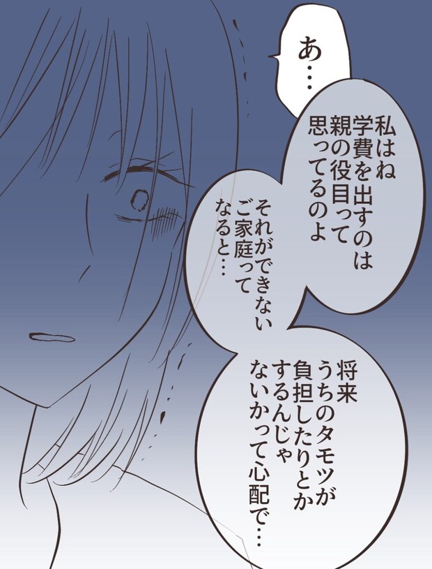 何も言えないまま固まる私に、「学費を出すのは親の役目、それができない家庭だと、将来タモツが負担せざるを得なくなるんじゃないかと心配で」と続けるタモツのお母さん。自分の夢を叶えるために、親に迷惑をかけないように借りた奨学金が、将来タモツの負担になるかもしれないと心配する気持ちは分かりますが、それと私の実家の経済状況とは何の関係もないはずです。
