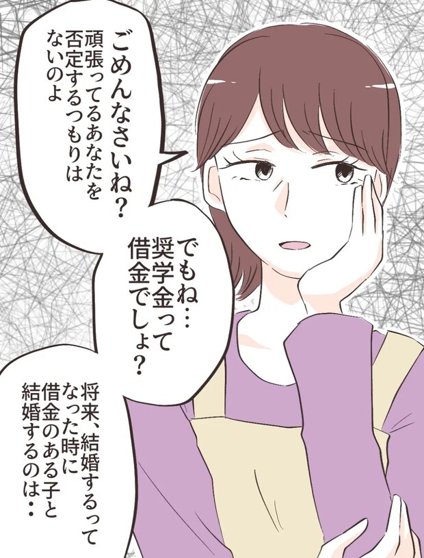 「頑張ってるあなたを否定するつもりはないのよ、でも奨学金って借金でしょ?将来結婚するってなった時に借金のある子と結婚するのは・・・」と、淡々と話すタモツのお母さん。今日家に招かれたのは、この話をするためだったんだ・・・と思いました。