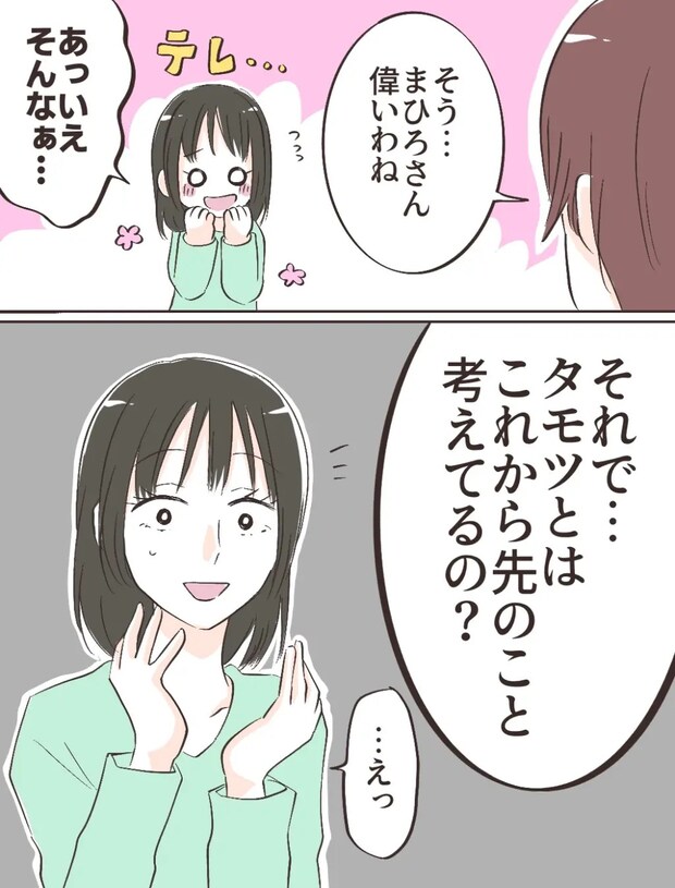 「そう、まひろさん偉いわね」と褒められたことに照れる私でしたが、「それで、タモツとはこれから先のこと考えてるの?」と聞かれ、固まってしまいました。これから先のこと、つまり「結婚」のことを聞かれるなんて思ってもいなかったからです。