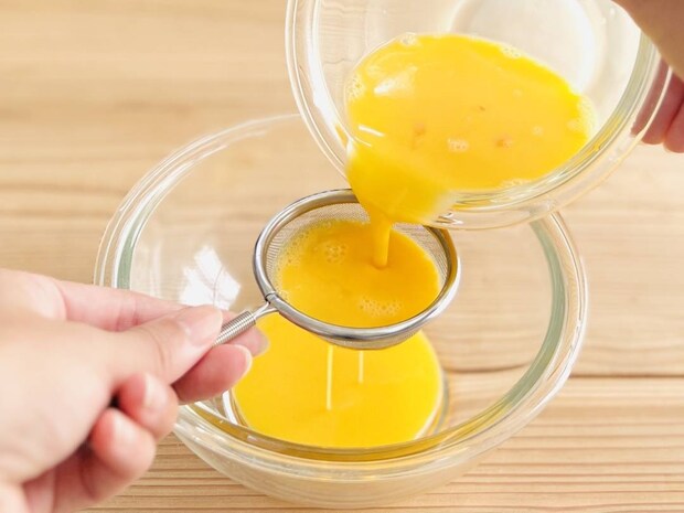 ボウルに卵、牛乳、塩を入れて混ぜ、茶こしやザルなどでこします。