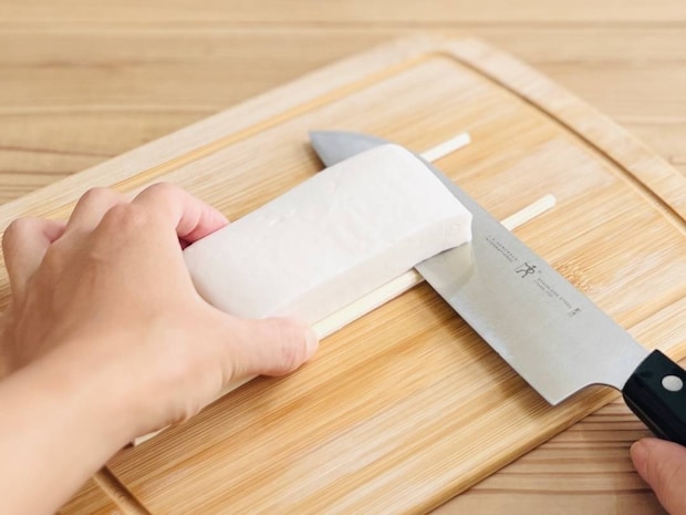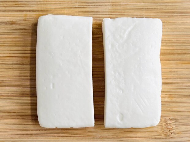 フライパンにサラダ油をひいて弱火で熱し、卵液を流し込みます。はんぺんを並べます。