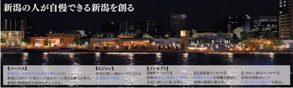 万代テラスとは、信濃川の河口部に位置し、国の指定重要文化財「萬代橋」を眺めながら、新潟のロケーションを楽しめる場所。万代テラスがある万代島地区は、「朱鷺メッセ」「市民市場(ピアBandai)」「万代島多目的広場(大かま)」などがある新潟港のエリア。