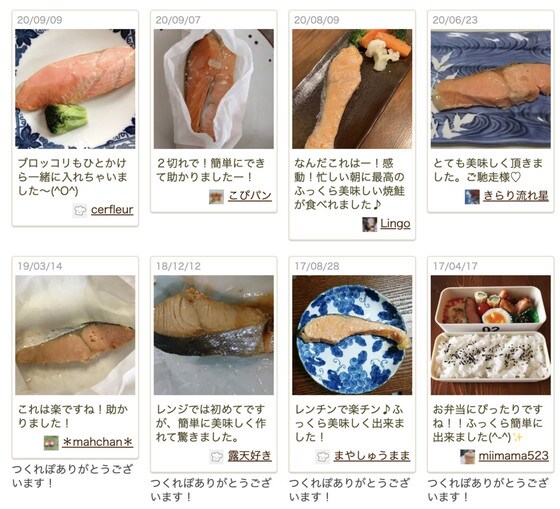 つくれぽ(作りましたフォトレポートのこと)には、楽・簡単・感動の言葉が!「レンジでは初めてですが、簡単においしく作れて驚きました」「感動!忙しい朝に最高のふっくらおいしい焼鮭が食べれました」など、そのふっくら感に皆さん大満足の様子です。