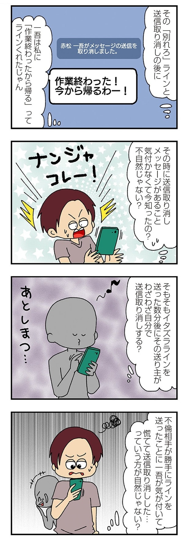 前回、夫・一吾のスマホから「あなたの夫は不倫している」とメッセージが届いたなつめ。メッセージはすぐに消されたため、なつめは一吾に直接聞くことに。すると、一吾は「俺こんなの知らないよ!」と言い…。