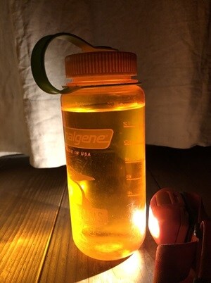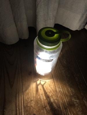 防災用品としてヘッドライトは持っているけど、ランタンは買い忘れた、という方にはこんな使い方も。小型のヘッドライトをナルゲンボトルの中に入れれば光が拡散してランタン代わりにも使うことができるのです。水を入れたボトルにライトの光を当てても同様にランタンがわりとして使うことが可能です。ボトルの色によって明かりの光の色が変わるので、いろいろな色のボトルを揃えておくと、楽しい気分になってお子さんたちも喜ぶかもしれません。