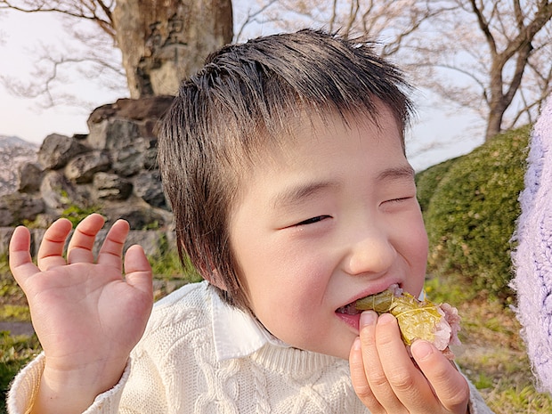 花見といえばやっぱり「団子」!ということで、子どもたちに黒みつ団子と桜餅を購入しました。