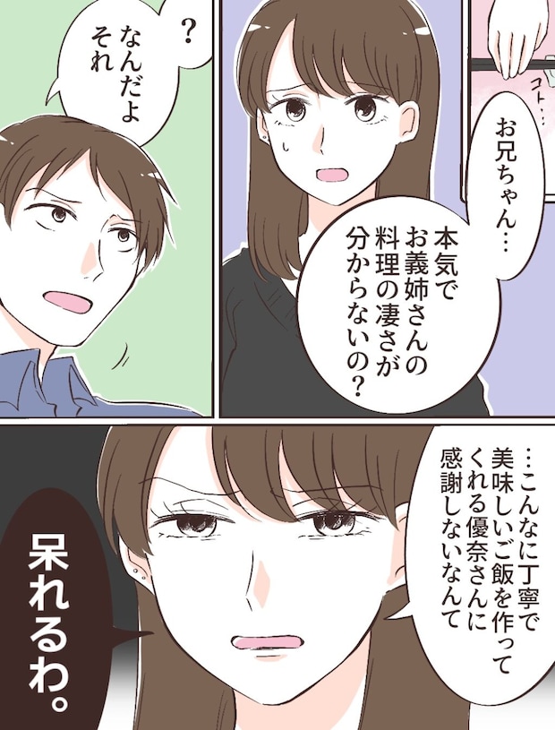 それを聞いたみのりちゃんは「お兄ちゃん、本気でお義姉さんの料理の凄さが分からないの?」と充に問いかけます。けれど充は「なんだよそれ」と、ピンときていない様子。みのりちゃんはそんな充に軽蔑するような視線を向け、「こんなに丁寧で美味しいご飯を作ってくれる優奈さんに感謝しないなんて、呆れるわ」と吐き捨てるように言いました。