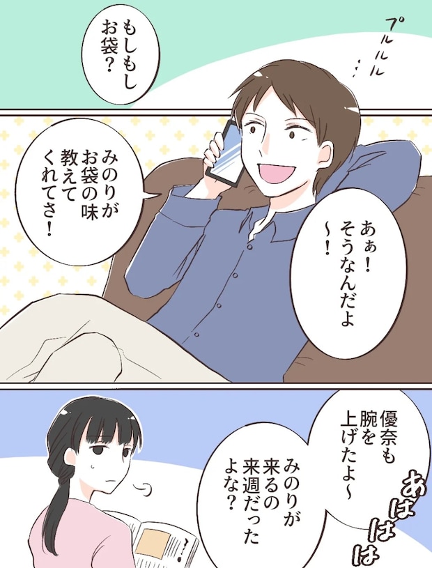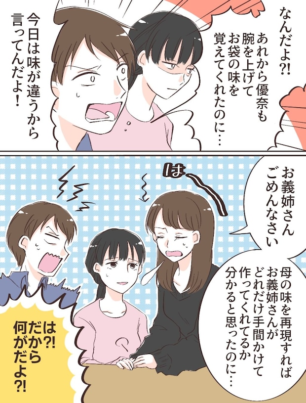 充はみのりちゃんの言葉の意味が分からないようで、「なんだよ!?あれから優奈も腕を上げてお袋の味を覚えてくれたのに・・・今日は味が違うから言ってんだよ!」と声を荒げます。みのりちゃんは大きくため息をつくと、「お義姉さんごめんなさい、母の味を再現すれば、お義姉さんがどれだけ手間かけて作ってくれてるか分かると思ったのに」と困ったように言いました。
