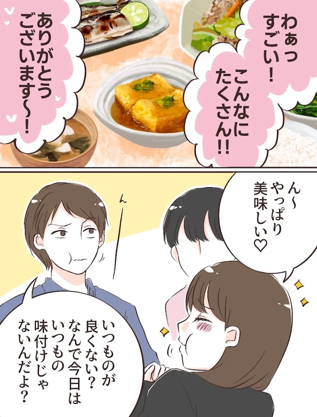 みのりちゃんは、机に並んだ料理を見て目を輝かせ「ん~やっぱり美味しい」と笑顔で頬張ってくれました。今日はあえて義母の味付けにせず、自分なりのやり方で手間ひまかけたので、喜んでもらえて何よりです。しかし充は、やっぱり義母の味付けのほうが好きなようで、「いつものが良くない?なんで今日はいつもの味付けじゃないんだよ?」と不満を漏らします。