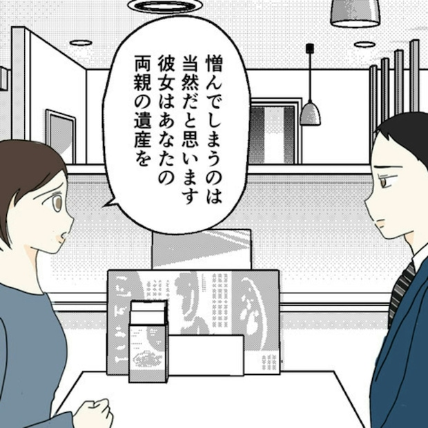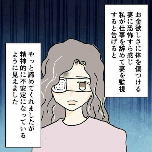 「夫のDV」だと思っていた、眼帯の女性のアザは、自作自演でした。さらに、お金やギャンブルに依存していた女性は、夫や義両親の遺産をねらい、この計画に乗ったのでした…。