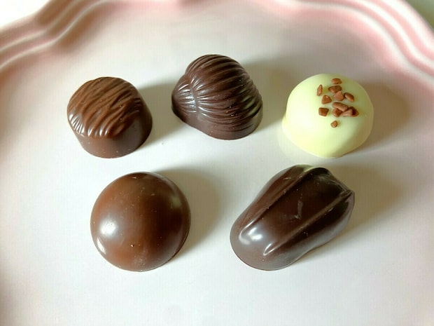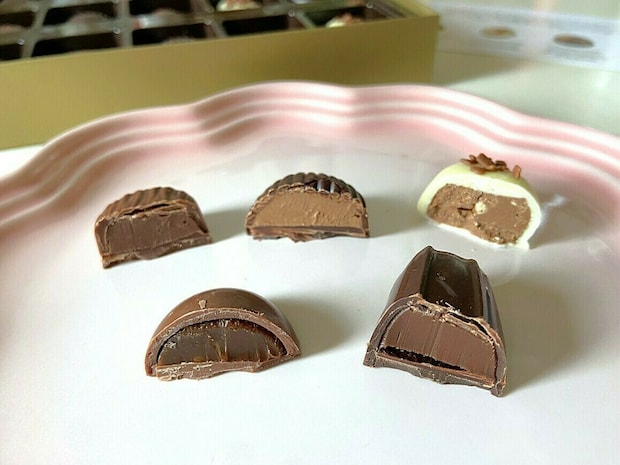 気になる内容は、ミルクチョコレートガナッシュ、ヘーゼルナッツフィリング入りのダークチョコ、塩キャラメルアーモンドジャンドゥーヤ、ヘーゼルナッツペースト入りチョコ、塩キャラメルガナッシュ入りのミルクチョコの豪華5種類!
