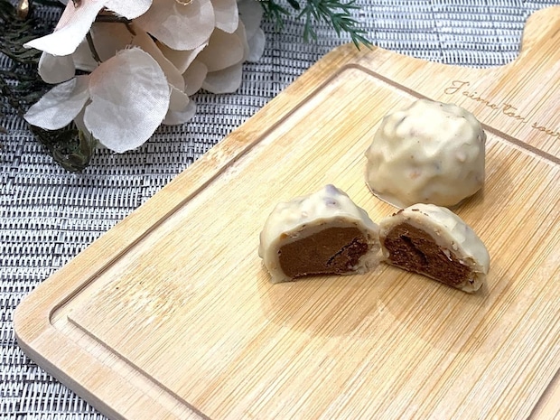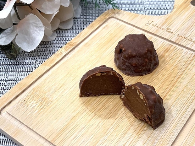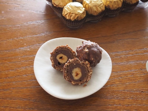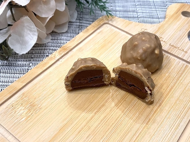 外側は細かく砕いたヘーゼルナッツを混ぜ込んだチョコレートでコーティングされています。