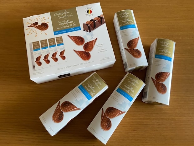 ベルギー産の「ハムレットチョコクリスピー」。大きな箱の中には4つの小箱が入っており、それぞれの箱に36枚のチョコクリスピーが収められていました。