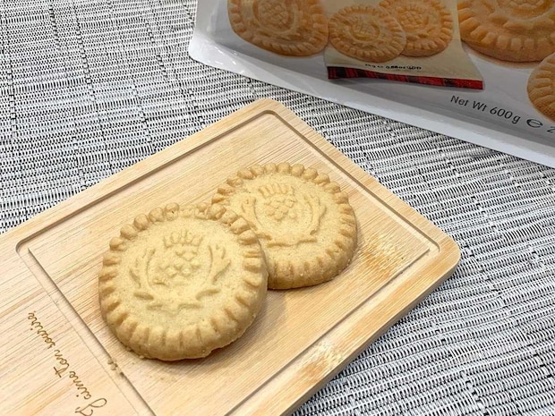 個包装の袋には、クッキーがそれぞれ2枚ずつ入っています。表面にはスコットランドの国花である「アザミの花」をデザインした模様が刻印されており、この刻印によって高級感が増しています。