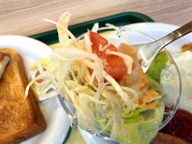 朝の野菜バーガーと同様、シャキシャキフレッシュな食感が美味しい!オーロラソースの甘味と酸味も効いており、朝からさっぱり食べられるサラダです。