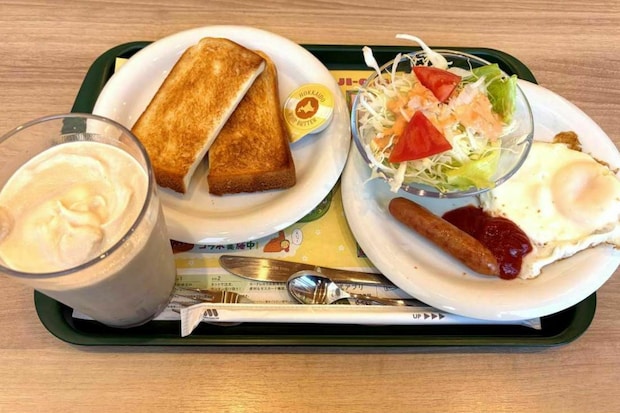 目玉焼き・ソーセージ・サラダ・トーストがセットになった一品。筆者はドリンクをセットにし、モスシェイクのコーヒー味を頼んでみました。