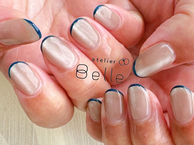 今回は、上品な輝きが魅力のゴールドベージュのマグネットカラーに、深みのあるブルーカラーで細フレンチに仕上げた大人っぽいネイルデザインをご紹介いたします。