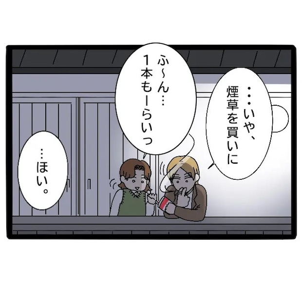 「いや、煙草を買いに」と言葉少なに告げる兄へ、よっちゃんは「ふ~ん。1本もーらいっ」と気さくに話かけます。よっちゃんと兄は2人並んで話し始めました。