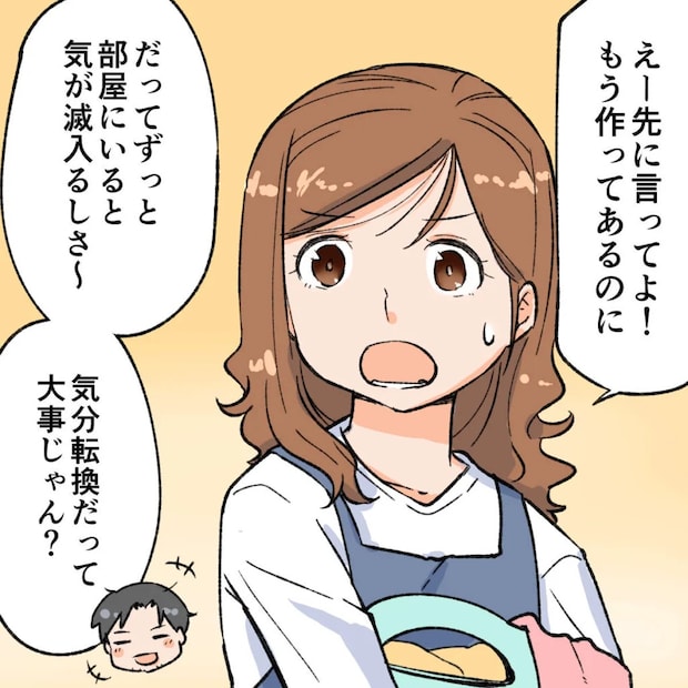 妻は「えー先に言ってよ!もう作ってあるのに」とちょっと怒っていましたが、外に食べに行こうと決めたのはついさっきですし、仕事中だったのですから先に伝えるのは無理な話。「だって、ずっと部屋にいると気が滅入るしさ~。気分転換だって大事じゃん?」午後からの仕事に備えてリフレッシュするのも大切ですよね。