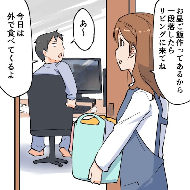 朝は一緒に食べられないので、お昼と夜はできるだけ家族で食べるようにしています。この日もいつものように「お昼ご飯作ってあるから一段落したらリビングに来てね」と妻が言いに来てくれたのですが、オレは今日は外食するつもりだったので「あ~。今日は外で食べてくるよ」と伝えました。
